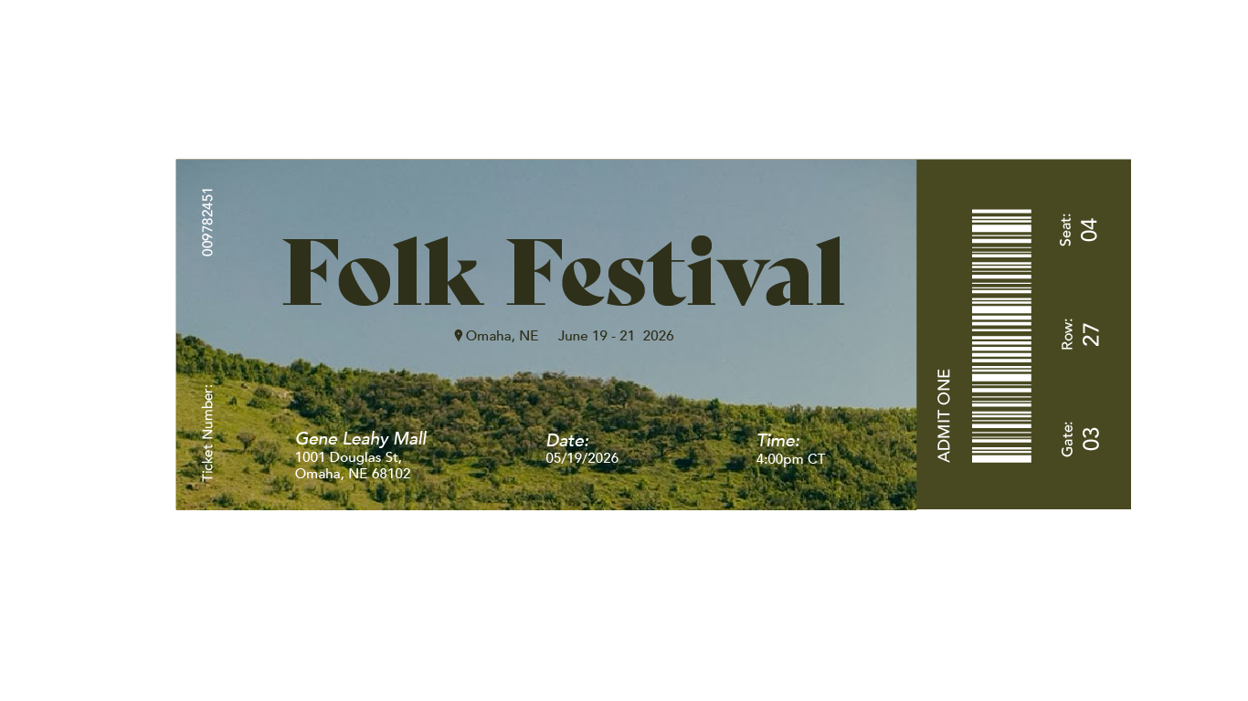 The design of the Great Plains Folk Festival embraces the earthy calm of the natural world, rooted in warm greens, soft neutrals, and organic textures that reflect the heart of folk artistry. Across the Instagram feed, ticket design, and website, these tones evoke the rolling prairies and peaceful simplicity of the Midwest landscape. Hand-drawn illustrations, vintage-inspired typography, and natural light imagery come together to create a sense of authenticity and craft. The result is a cohesive visual identity that feels grounded, inviting, and reflective of the creativity and connection at the core of the festival experience.